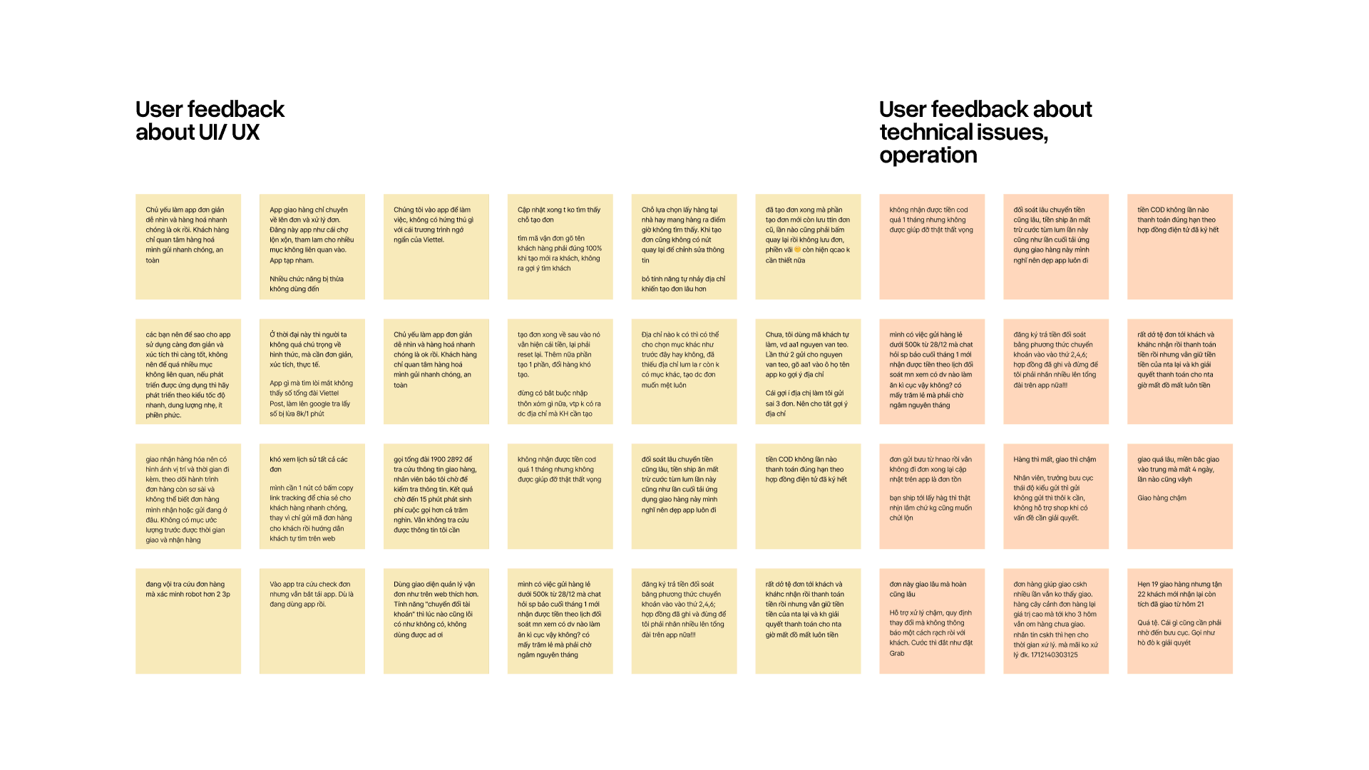 With a constrained 1 month Phase 1 timeline, the team prioritized rapid insight gathering over extensive user studies. We analyzed user reviews and feedback across Viettel Post's digital touch points to identify critical pain points.